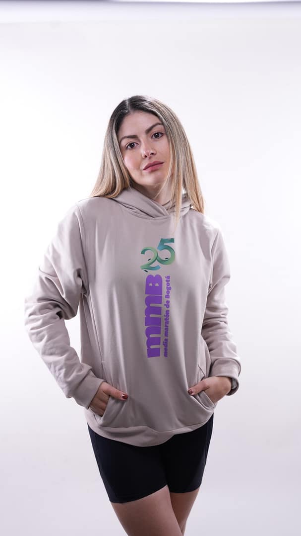 Celebra un cuarto de siglo de historia con el hoodie oficial de los 25 años de la media maratón de Bogotá. Esta edición especial en tono arena cuenta con un estampado vertical que combina el icónico logo mmB con el número 25, en un diseño moderno y vibrante. Su confección en materiales suaves y térmicos lo hace ideal para mantener el calor antes y después de tus entrenamientos, o para lucir con estilo en cualquier momento del día. Corte cómodo, capucha envolvente y bolsillos laterales funcionales. 100% hecho en Colombia.